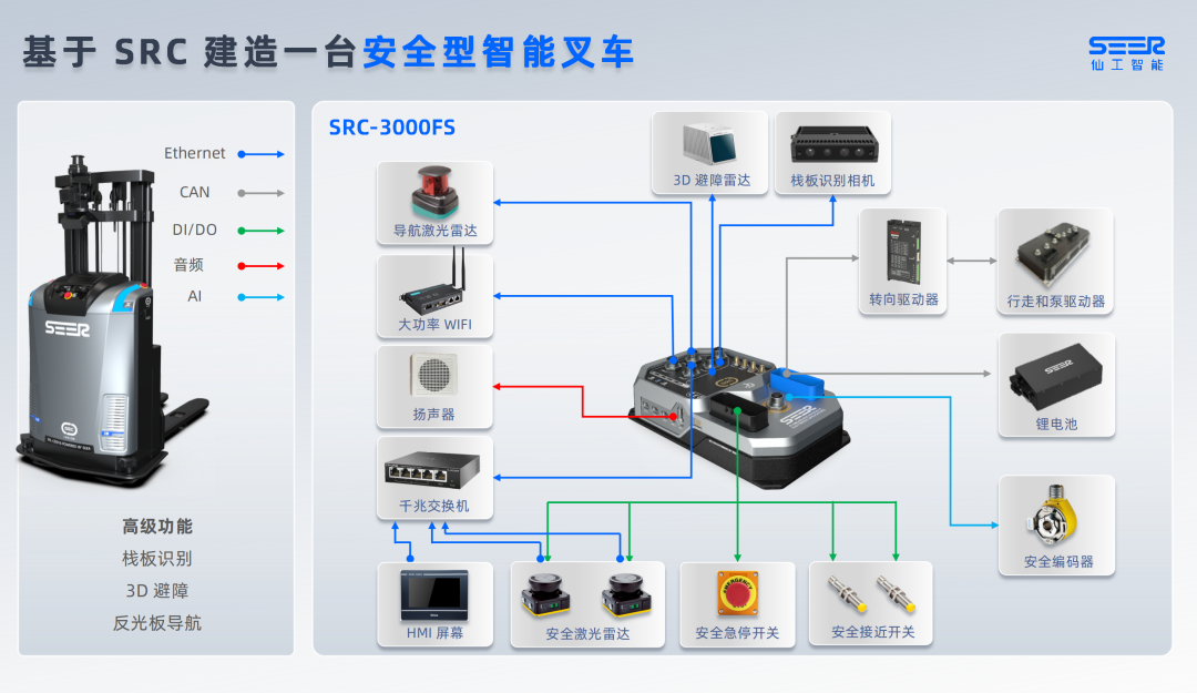 2023 年,仙工智能重磅自研升级,推出智能叉车专用版安全型控制器 SRC-3000FS,算力性能更强悍,并且完美匹配欧美市场叉车需求。海量零部件高效适配,自由选型,赋能合作伙伴快速造车,交付无忧。