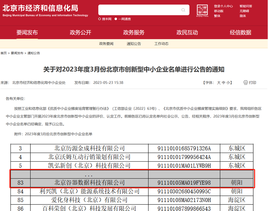 近日,北京市经信局公布了“2023年度3月份北京市创新型中小企业名单”,经过相关部门的评价、认定,谷器数据成功入选。这也是谷器数据首次荣获创新型中小企业认定!