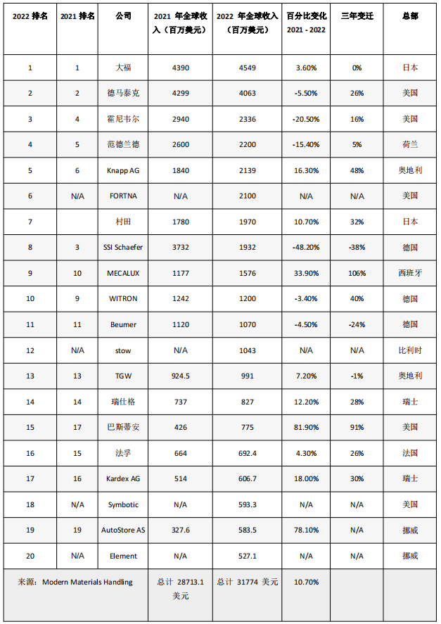 大福(Daifuku)仍以454亿美元的年销售额位居榜单第一,高于2021年的439亿美元收入。大福将其持续增长归功于上一年的大量订单积压、对半导体制造商的强劲销售、零售系统的扩展和电子商务部门,并提高了服务收入。 Dematic作为属于德国凯傲集团(KION Group)的供应链解决方案部门,仍排名第二,其收入低于去年。其2022财年供应链解决方案部门的收入从欧元转换为406亿美元,低于上一年的429亿美元(2021财年)。 Covid-19推动了市场历史性的投资,我们认为这是不可持续的。在此期间,德马泰克(Dematic)的增长高于市场。今年,我们面临着外部和内部的挑战,因为全球地缘政治和宏观经济发展加速了我们供应链的波动,导致我们的材料、能源和物流成本急剧上涨。尽管存在这种波动,但我们仍专注于为客户提供服务,投资于我们的员工和战略计划。”- Dematic总裁兼KION执行董事会成员Hasan Dandashly表示。 Honeywell Intelligrated排名第三,其2022年收入为23.3亿美元,低于2021年的29.4亿美元,但仍有上升趋势。霍尼韦尔(Honeywell)的领导层认为自动化解决方案具有长期增长潜力。 霍尼韦尔安全与生产力解决方案总裁兼首席执行官George Koutsaftes表示:“近年来,全球供应链被迫适应了剧变,”他说。“大流行病和在线购物的迅速崛起给电子商务基础设施和物流带来了巨大压力。如今,各行各业都在转向自动化和数字化,以建立更安全、更高效的运营,提高应对需求快速变化的能力。” KNAPP在又一个强劲的增长年中排名第五,2022年的收入为21.3亿美元,高于18.4亿美元。KNAPP北美营销副总裁Kevin Reader表示,KNAPP在医疗保健、零售、食品、时尚、仓储和制造等所有主要领域都取得了增长。 Reader补充说,KNAPP在当年投资近7000万美元用于研发,持续改进其解决方案,如可在六个月内部署的穿梭系统、名为Zero Touch的全自动袖珍系统,以及名为KiSoft Genomix的自动化主数据平台,用于扫描和管理自动化部署所需的数据。 FORTNA排名第六,其收入达21亿美元,从某种意义上说,是我们榜单上的新成员。在2022年4月,MHS Global(去年在我们的前20强中排名第8)与领先的系统集成商、软件和解决方案提供商Fortna合并,共同成立了FORTNA。MHS和FORTNA都是Thomas H. Lee Partners投资组合的一部分,Thomas H. Lee Partners仍然是合并后公司的主要股东。 去年11月,该公司宣布MHS和FORTNA将合并为一家名为FORTNA的公司。FORTNA的首席执行官Rob McKeel在当时解释说,利用市场对FORTNA名称的认可是有意义的。“我们选择FORTNA这个名字,不仅是因为这个名字在市场上已经享有很高的声誉,而且还因为它所蕴含的力量和韧性,”他说。 排名第七的是Murata Machinery,其2022年收入为19.7亿美元,高于17.8亿美元。Murata董事总经理Takenori Yanai评论说,这一增长得益于半导体行业以及医药批发和零售行业对仓库自动化的需求不断增加,尤其是在Covid-19期间加速增长。他指出,组件短缺、运费上涨和美元价值对业务产生了一些负面影响。 位列第八的是SSI SCHAEFER Group,该公司报告2022财年的收入为181亿欧元,即19.3亿美元。根据公司新闻稿,2022财年的重点是加强集团的创新能力。该集团最近还签署了收购移动机器人供应商DS Automotion GmbH的协议。 排名第九的是MECALUX,报告的收入为15.7亿美元,高于11.7亿美元。作为全球供应商,MECALUX以其存储解决方案闻名,并提供仓库管理软件。 WITRON Integrated Logistics排名第十,2022年收入为12亿美元,低于2021年12.4亿美元的收入。该公司将其业绩归功于食品零售行业在干货、新鲜和冷冻产品领域的持续实力。 在我们名单的后半部分可以看到一些变动,包括一些新进入者的显著收入使一些知名供应商落后。 伯曼集团排名第11,其2022年收入为10.7亿美元,略低于11.2亿美元。2022年5月,该集团收购了FAM GmbH,扩大了伯曼在矿物和采矿部门的产品组合。 排名第12的是stow Robotics,收入为10.4亿美元。该公司的产品包括单位负载自主移动机器人(AMR)、货架、自动托盘穿梭车、半自动托盘穿梭车和垃圾箱/手提袋穿梭车。去年5月,stow收购了巴黎的AMR供应商iFollow SAS的多数股权。 排名第13的是TGW Logistics,收入为9.91亿美元,高于9.245亿美元,保住了第13名。 Swisslog排名第14,总收入为8.27亿美元,高于7.37亿美元。Swisslog首席执行官Antonio Trioschi表示,尽管整个行业面临经济和供应链方面的挑战,但Swisslog在这一年取得了强劲的业绩,超过了其三个主要财务KPI,并创造了订单积压的记录。 “我们改进了进入市场的方式,加强了我们在战略市场的地位,特别是在电子商务领域。作为这一战略重点的一部分,我们将特定解决方案部署到食品和饮料市场(包括食品杂货),帮助公司在2022年实现增长。”Trioschi说。 “我们继续看到供应链领导者面临压力,要求他们对中断、供应短缺和安全事件进行技术响应。”“在Bastian Solutions,技术和创新是我们业务的核心,但正是我们才华横溢的员工队伍在今年取得了成功。”-Greg Conner,企业发展和营销高级副总裁。 Fives Group旗下的Fives Intralogistics以6.64亿美元的收入排名第16,略低于6.924亿美元。 “在供应链受到重大影响的一年里,尤其是电气和控制元件,我们不得不更深入地挖掘并改变我们对如何提供系统、产品和服务的看法。”这种转变不仅使我们能够提供所需的结果和发展业务,而且为我们的客户和市场的长期利益奠定了基础。”-Don Keel,Fives Intralogistics Corp.总裁兼