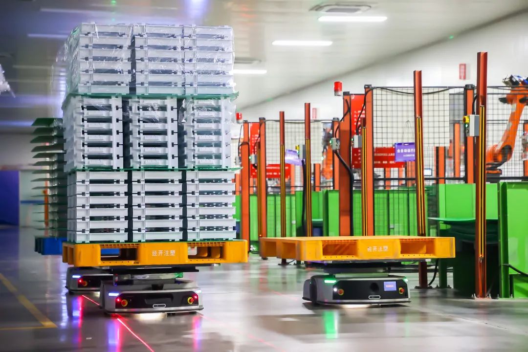 库卡助力美的(合肥)冰箱注塑工厂落地了基于“激光SLAM AMR+叉车AMR+软件系统”的一体化物流系统解决方案,打造从原料入库、加工、出库全流程智能物流系统,使其成为美的集团19家注塑工厂的首个标杆工程,升级为注塑工厂首屈一指的绿色智能黑灯工厂。