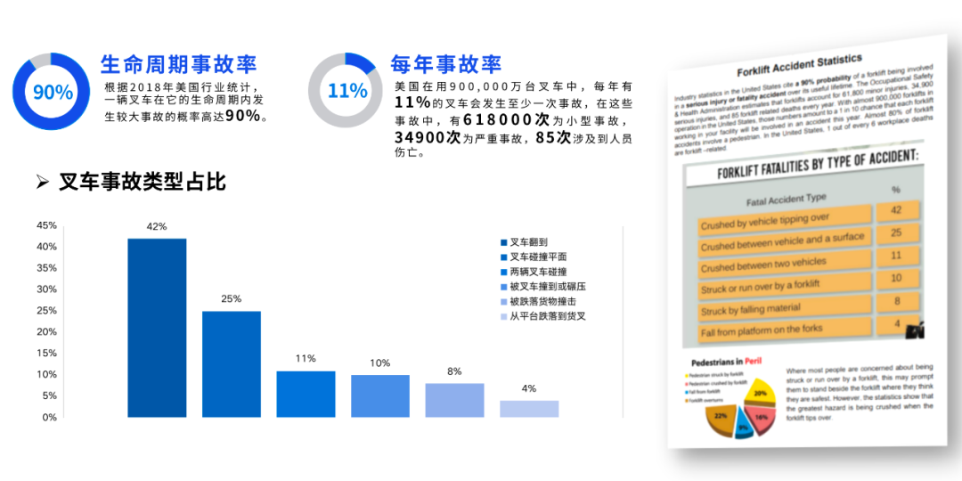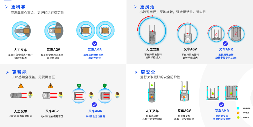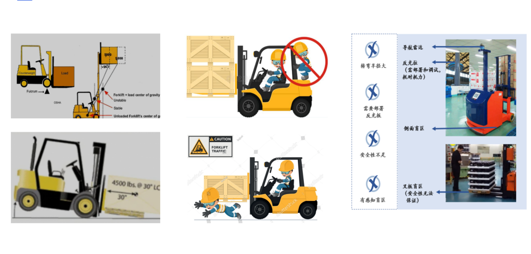根据2018年美国行业统计,一辆叉车在它的生命周期内发生严重事故的概率高达90%。分析造成事故的主要因素,叉车重心不稳造成侧翻、盲区过大造成的碰撞、以及叉车外露造成的人员伤亡,占比非常高。叉车2.0的创新趋于保守,无法突破因人工叉车整体设计和运动方式导致的行驶空间、运行效率、安全性等方面的限制,显然难以满足工业自动化、数智化转型的高效率、高安全需求。