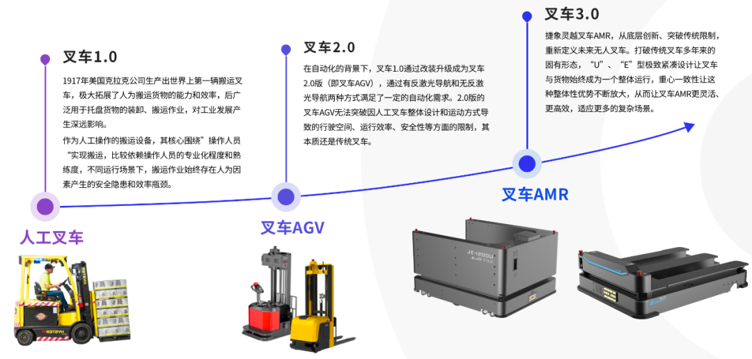 在吕峰的演讲中,将叉车的发展史分成两个世代。叉车1.0版是人工叉车,1917年美国克拉克公司生产出世界上第一辆叉车,极大拓展了物料搬运能力和效率,对工业发展产生深远影响。在自动化的背景下,人工叉车通过改装升级,通过有反激光导航和无反激光导航两种方式满足了一定的自动化需求,步入叉车2.0世代,即叉车AGV,然而其本质还是传统叉车。