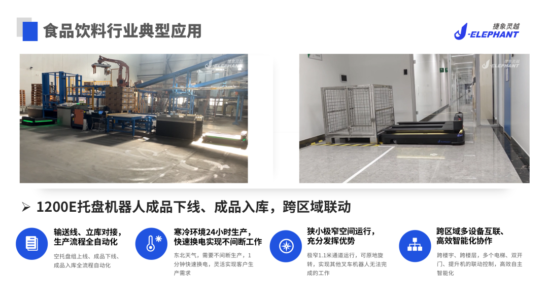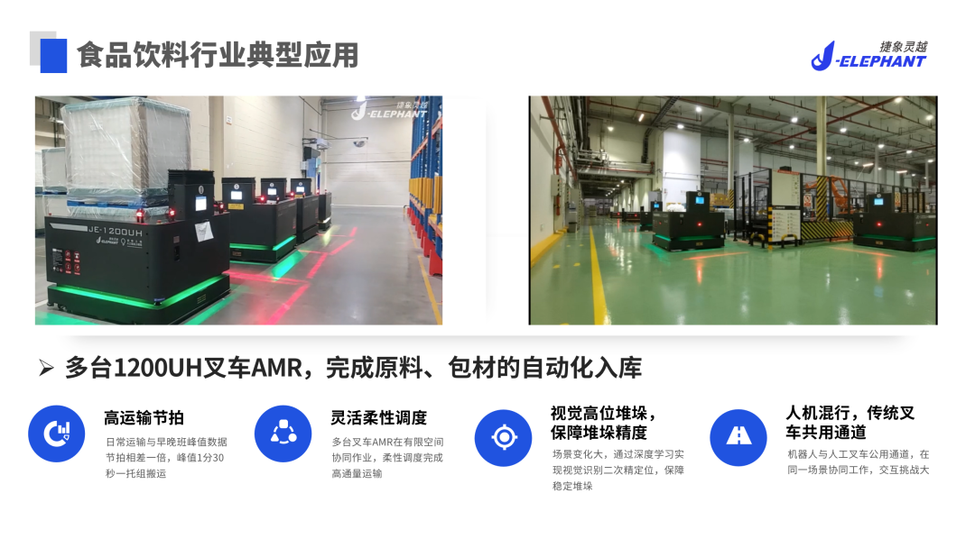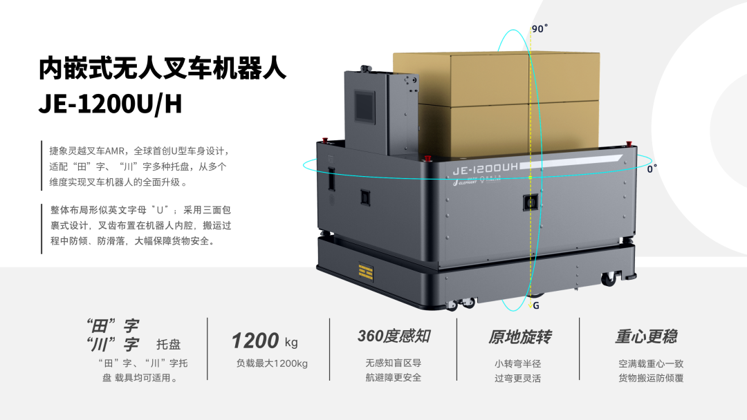 捷象灵越(J-Elephant)是一家面向智能制造的机器人公司,以自研、全球独创的U型无人协作 叉车机器人系列产品为核心,以平台协作型机器人产品为补充,致力于给生产制造客户提供高效率、高柔性、高可靠性的标准化产品和综合智能物流解决方案。