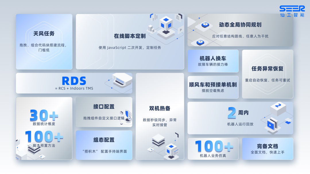 RDS 通过对仙工智能上百个包含定制业务的项目进行深入分析,并从中归纳出若干个通用业务方案,为客户提供了极大的便利,提升项目交付效率的同时降低定制业务的开发门槛。用户无需从 0 开发,可直接使用「通用业务」模板,根据个性化需求,快速构建属于自己的业务流程。