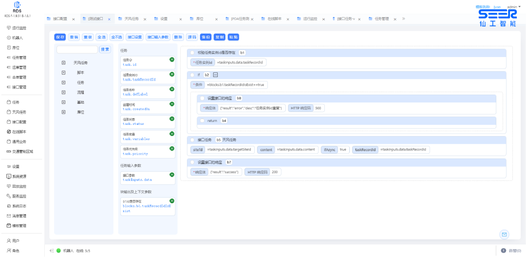 RDS「接口配置」包括定制化接口和手持端接口两类配置,用户无需再为繁琐的代码编写而烦恼,通过拖拽的方式自定义接口逻辑,快速完成接口开发,实现系统间交互,大幅提升开发效率。