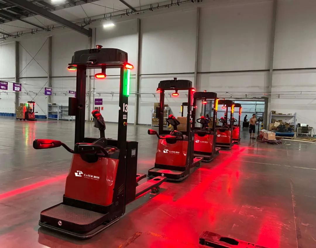 在物流中转中心人车通行,场内作业工况复杂,科钛机器人为其匹配多重安全保障系统,人行识别的AI,身体任何一个部位进入设定区域,搬运机器人AGV均会自动停止,并鸣笛示警。分级避障,多重警示,让场内作业更安全。