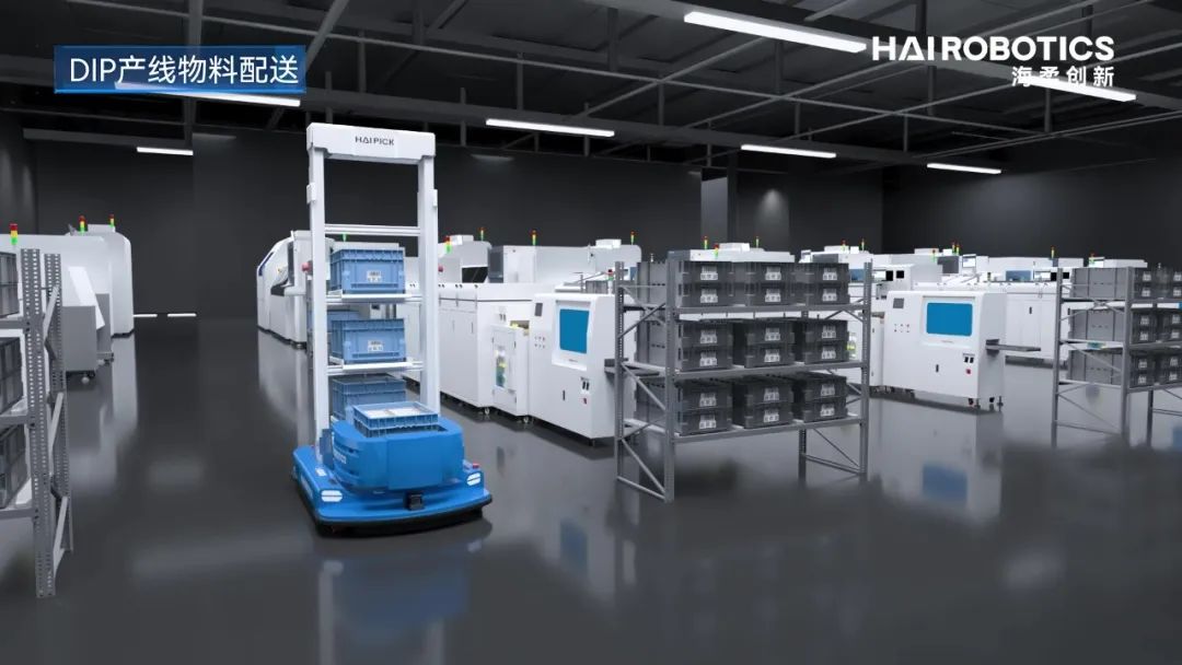 而针对DIP产线,配备SLAM导航的ACR以更细颗粒度模式进行物料配送,将原材料送到产线工位,实现及时补料。