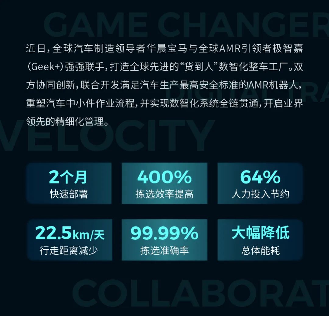 关于华晨宝马华晨宝马汽车有限公司成立于2003年5月,是宝马集团和华晨集团共同设立的合资企业。业务涵盖宝马品牌汽车在中国的研发、采购、生产、销售和售后服务。华晨宝马聚焦高质量发展,致力于成为可持续高档个人出行服务提供商,并引领中国汽车行业整个价值链的可持续发展。2021年,华晨宝马生产了超过70万辆汽车,在中国首次成为豪华汽车产量最大的汽车制造企业。同时,宝马的销售和服务网络遍及全国,在中国拥有683个经销商服务网点,客户满意度在一众高档汽车品牌中名列前茅。关于极智嘉(Geek++)作为基于机器人技术的智能物流解决方案专家,极智嘉提供全品类物流机器人产品线和解决方案,赋能企业实现物流智能化升级。目前,极智嘉拥有遍及40多国的全球化销售、运营和服务能力,服务于耐克、沃尔玛、丰田、西门子、宝马等超700家大客户,项目覆盖电商、零售、鞋服、医药、3PL、新能源、汽车、3C等行业,商业落地规模引领业界。