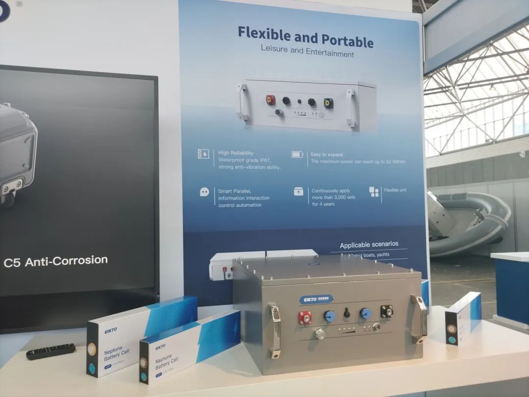 益佳通电池本次全球首展的51.2V90Ah的船舶舷外机动力产品,是益佳通研发团队充分挖掘客户需求、密切联系应用环境,基于益佳通独有的商业思维和对产品应用的深刻理解,开发出的一款完全具有自主知识产权的产品,其卓越的优势主要表现在:外观高度精简、内外构造高度整合、应用高度便捷、可以快速移动、高安全、高可靠;具体则包括,外观与构造完美合一,品质和高科技通过外观完美呈现;独到的整合技术,深度整合快速插拔头、外观以及内部构成件、使产品可以快速移动;人性化的管理、人机互动性好,搭配仪表显示功能,可以更快更准确的掌握电池情况;耐腐蚀性强,腐等级可以达到C5级别;卓越的散热性能,采用大量散热翅设计,能有效散发热量;长久续航能力,电芯使用高倍率电芯,可应对大电流工况且发热量低,利于长时间使用。高安全,防护等级达到IP67。