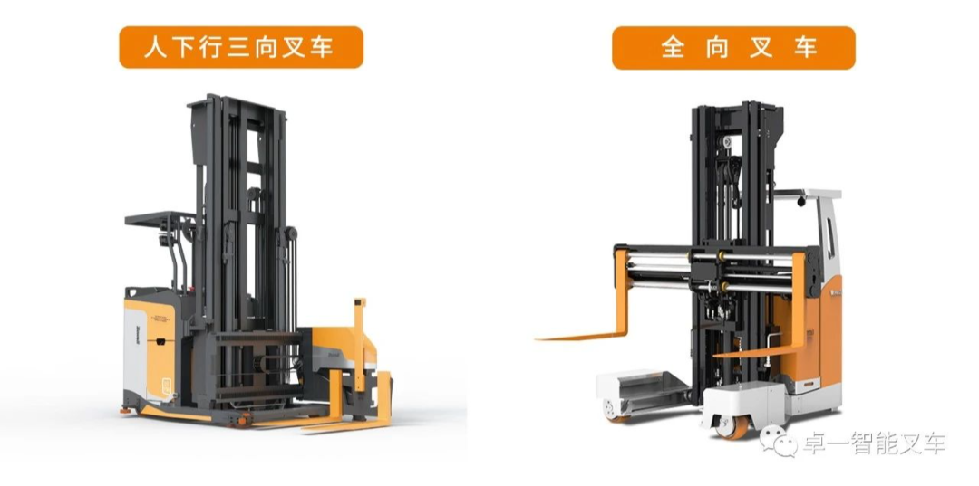 卓一智能叉车长期专注窄巷道物流仓储,洞悉长物料行业物流需求,凭借多年积累打造出技术成熟的长物料专用叉车,并将此款叉车——全向车,带到了展会现场,同时带来的还有卓一的另一款窄巷道明星产品——人下行三向叉车。