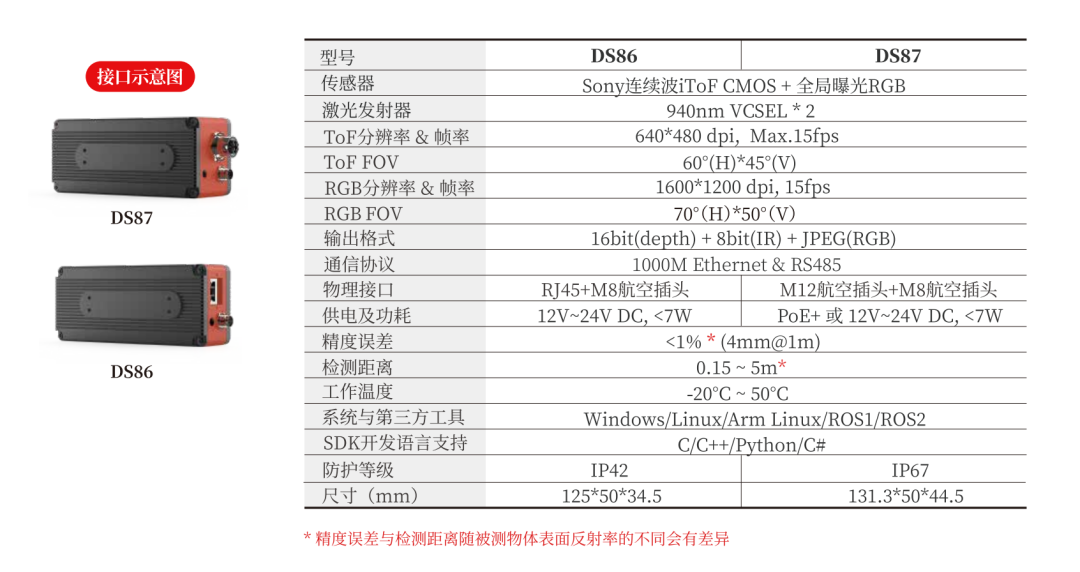 在本次VisionChina上海机器视觉展上,维感科技将首次展出DS系列的新产品 —— DS86&DS87,这款RGB-D ToF相机不论在外观还是性能上都有所突破和优化(参数见下表),与同类同质量产品对比,其在价格上也兼具优势。这款新品相机的适用性、灵活性和可定制性可以满足不同行业和应用领域的需求。