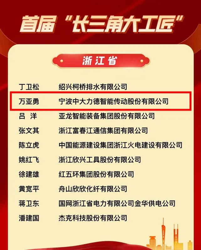 6月28日,沪、苏、浙、皖三省一市工会召开2023年推进长三角高质量一体化发展工会工作联席会议,会议命名40人为首届“长三角大工匠”,宁波中大力德智能传动股份有限公司设备科科长万亚勇荣登首届“长三角大工匠”榜单!