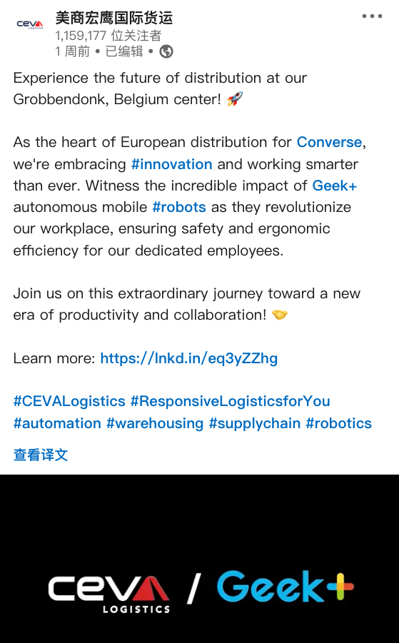 ▲ CEVA Logistics在社交媒体上首度曝光与极智嘉携手打造的欧洲物流中心