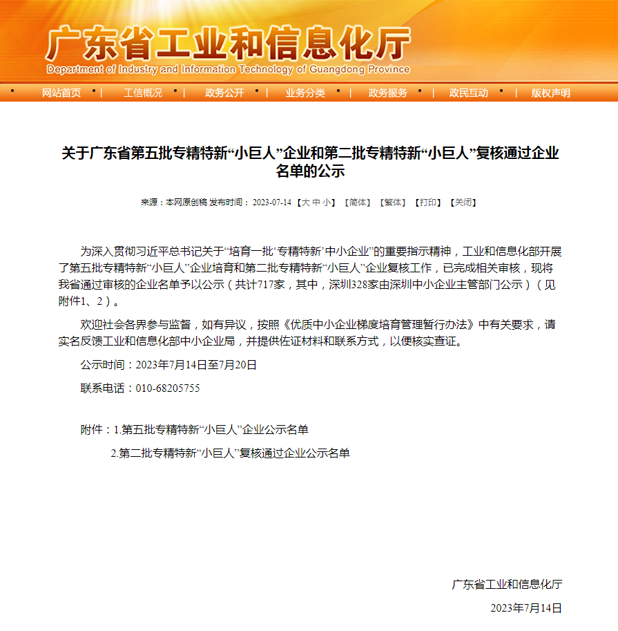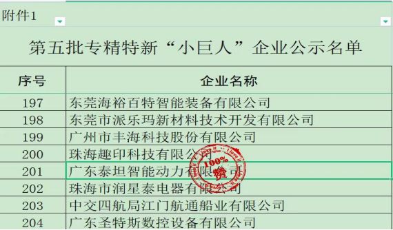 2023年7月14日,广东省工业和信息化厅发布了《关于广东省第五批专精特新“小巨人”企业和第二批专精特新“小巨人”复核通过企业名单的公示》,广东泰坦智能动力有限公司通过国家级专精特新企业审核,荣获“小巨人”称号。