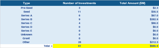 验证:资金信息来源于许多公共和私人的来源。其中包括企业和投资集团的新闻发布、企业简介、市场研究公司以及协会和行业出版物。此外,还包括来自会议和研讨会的会议以及对行业代表、投资者和其他人的私人采访。对于无法验证的投资将会被排除,并对未提供或不明确的投资金额进行估计。