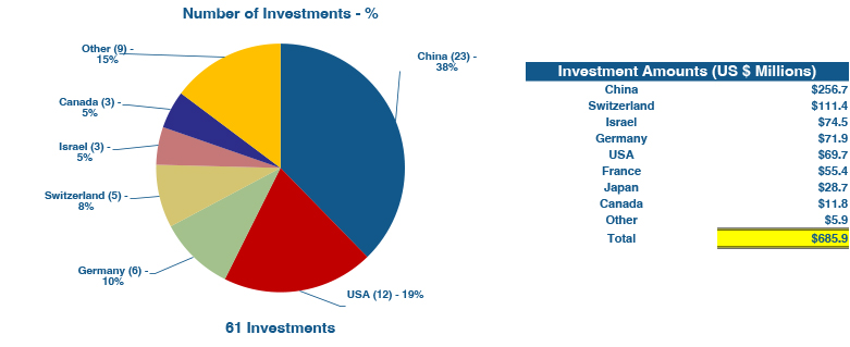 在所有国家中,中国的公司获得了最多的融资轮数(23轮)和最大的投资金额(2.57亿美元),见下图1。紧随其后的是瑞士,公司获得的投资达到了1.11亿美元,其次是以色列(7500万美元)、德国(7200万美元)和美国(7000万美元)。
