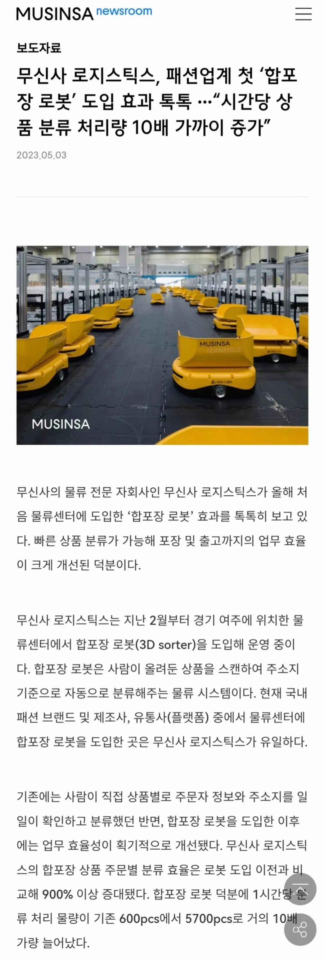 2022年,MUSINSA选择与立镖联手,引进3D系统。该系统占地500㎡,为韩国同类项目中最大,共设置了两层平台,部署上下各50台、总计100台机器人,配备30台3D分拣机。截至目前,已正式投入使用5个多月,成果喜人:每小时分拣量提升了10倍!点击查看详情