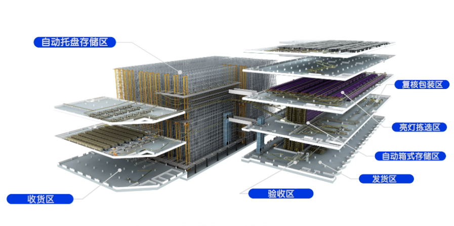 物流中心内设有阴凉库、冷藏冷冻库、管制类药品库;配有收货区、验收区、自动托盘存储区、自动箱式存储区、拣选复核区及发货区。