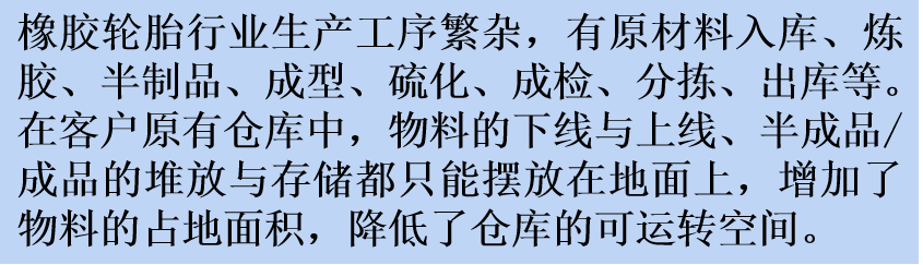 此次服务的客户为综合实力全国领先的橡胶轮胎企业,存在生产工艺工序复杂、存储空间有限、搬运效率较低的痛点。