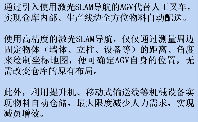 AGV代替人工叉车,实现全方位物料自动配送和物料自动仓储,最大限度减少人力需求,实现减员增效