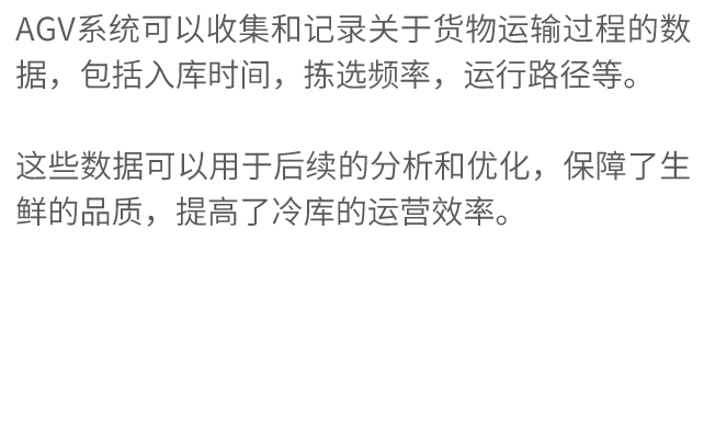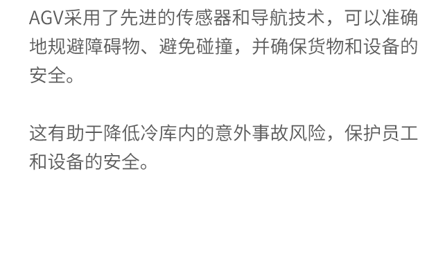 如何在低温恶劣环境中,提高分拣速度与精度,保证高效的物流运转能力的同时,尽可能地降低损耗,是负责本项目的嘉腾所考虑的重点。在联合科尔摩根的建议后,双方共同开发了适应低温冷库环境的特殊AGV解决方案,包括采用电池加热、防水、改进除雾装置等技术手段,以增强AGV在低温环境下的性能和可靠性,圆满地解决了低温冷库中的面临的一系列难题,并首次在-25℃的冷库中成功交付。