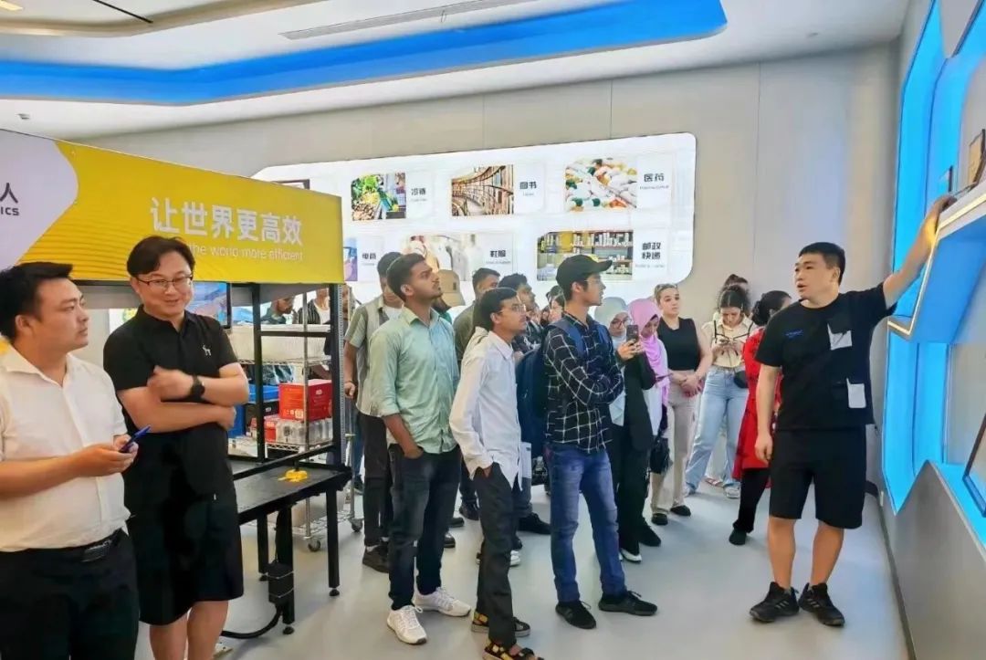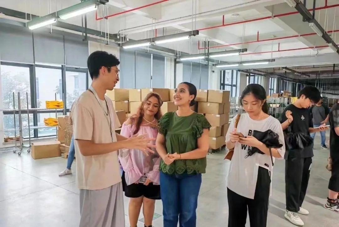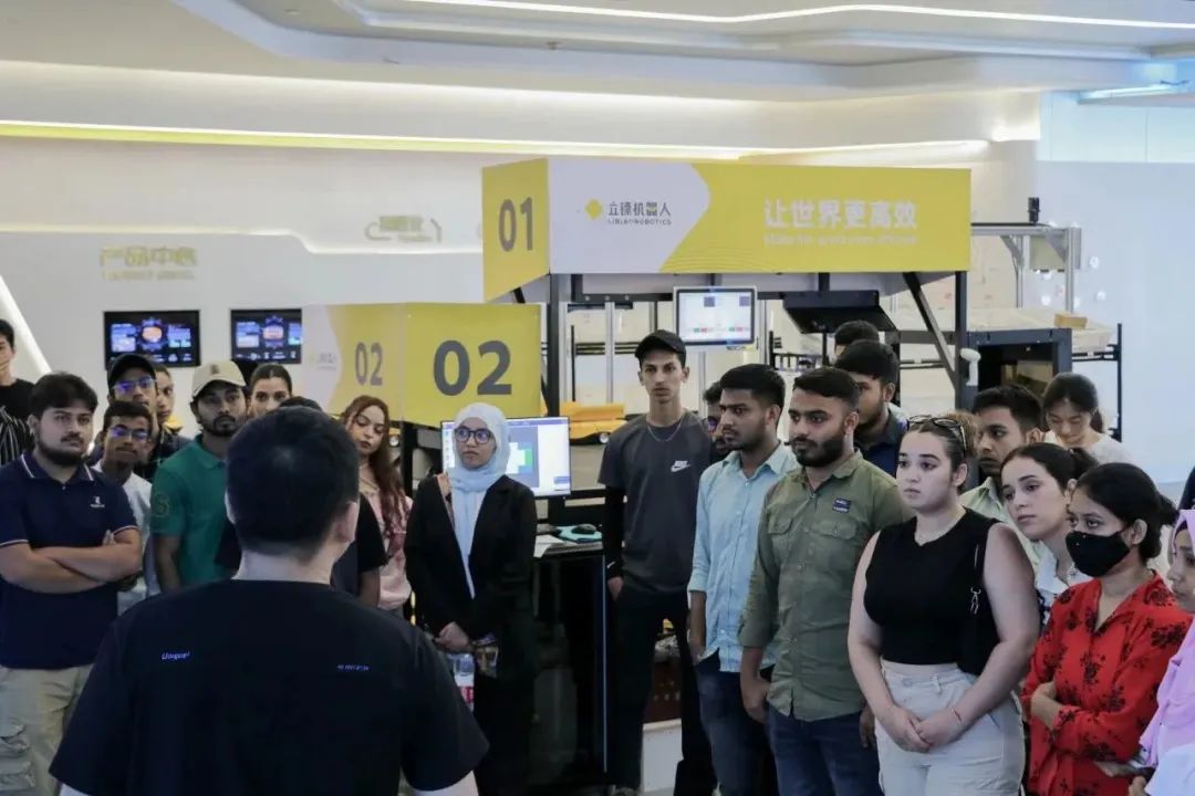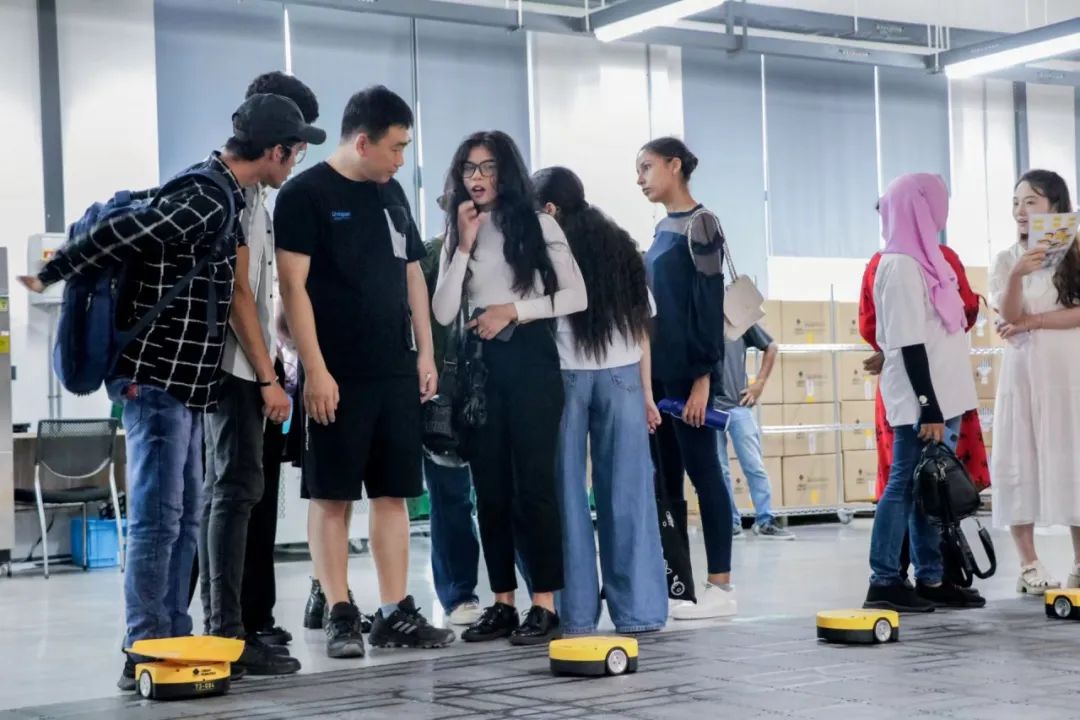 杭电留学生与电子信息学院学生代表团首先参观了立镖园区,了解立镖的创业历史、发展现状,观摩了机器人分拣的运作模式。立镖团队还向他们介绍了立镖机器人智能分拣系统的特点、优势,以及应用行业和场景。代表团学生对此非常感兴趣,纷纷询问,进一步感知到了科技带给人类的便利,也在心中埋下了一颗今后在机器人领域大展拳脚的种子。