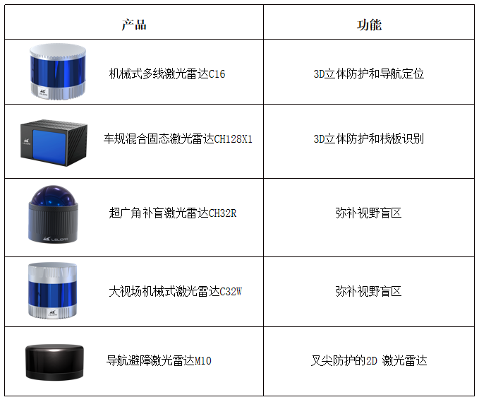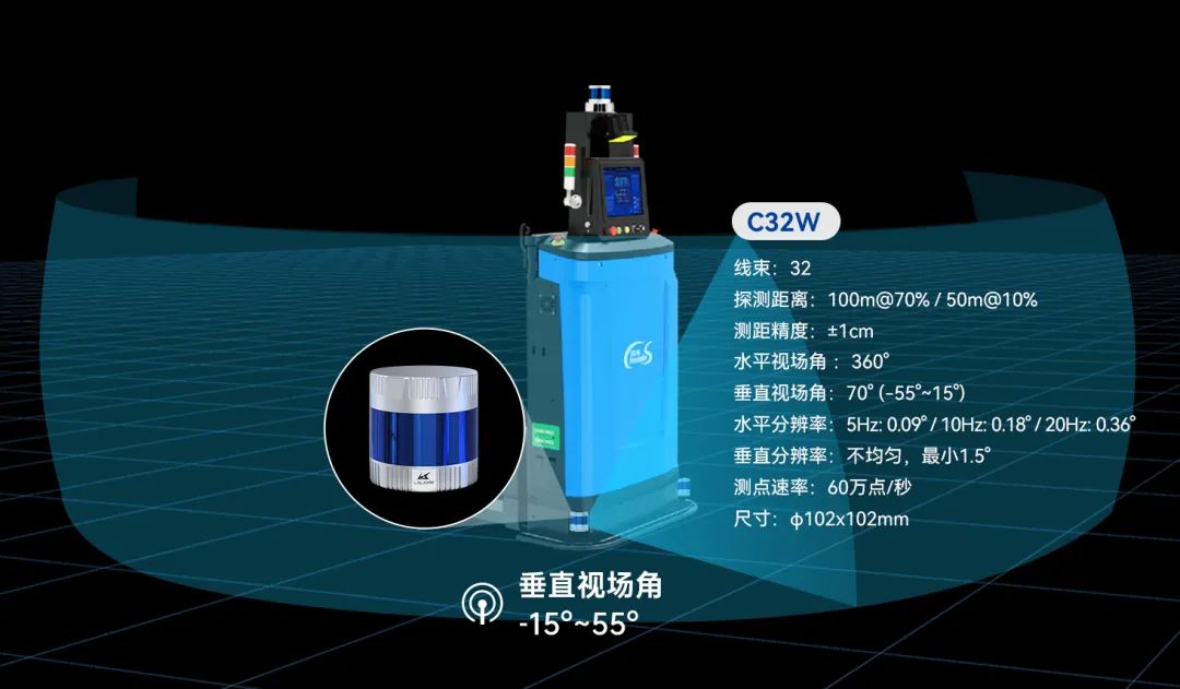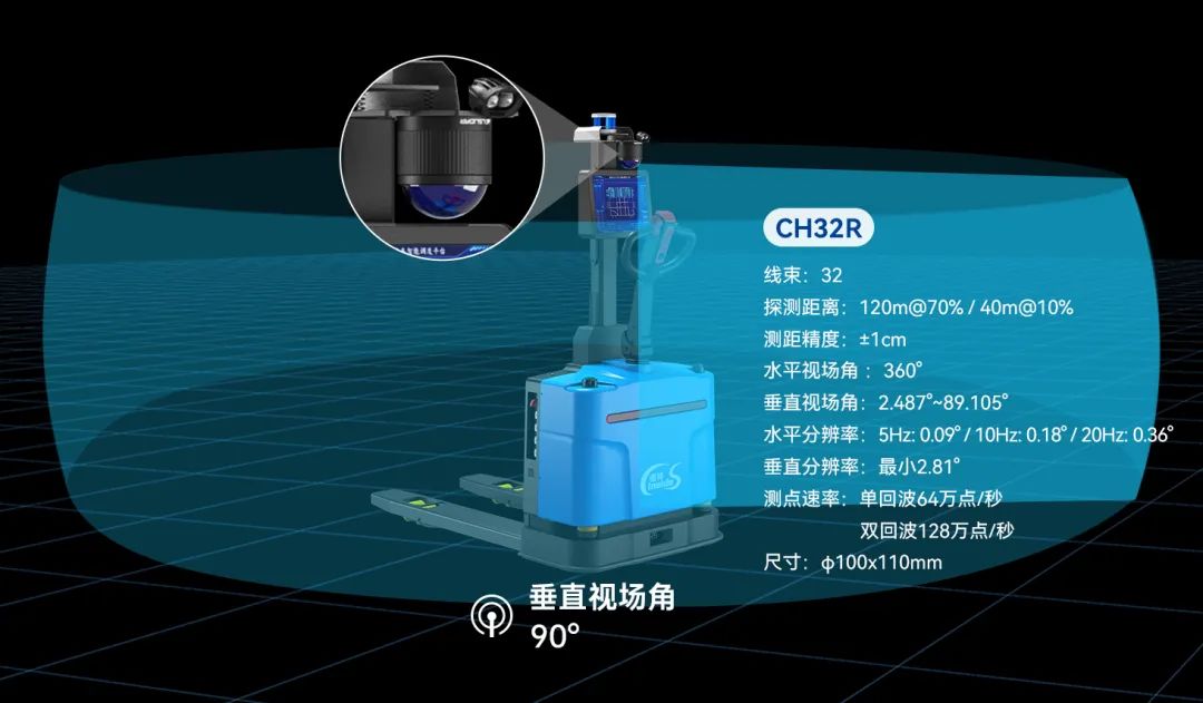 其中,“CH32R超广角补盲激光雷达”与“C32W大视场机械式激光雷达”是镭神智能专为各类移动机器人推出了两款专业补盲激光雷达 ,旨在为无人叉车更广阔的视野,实现三维立体防护,保障无人叉车的作业安全。