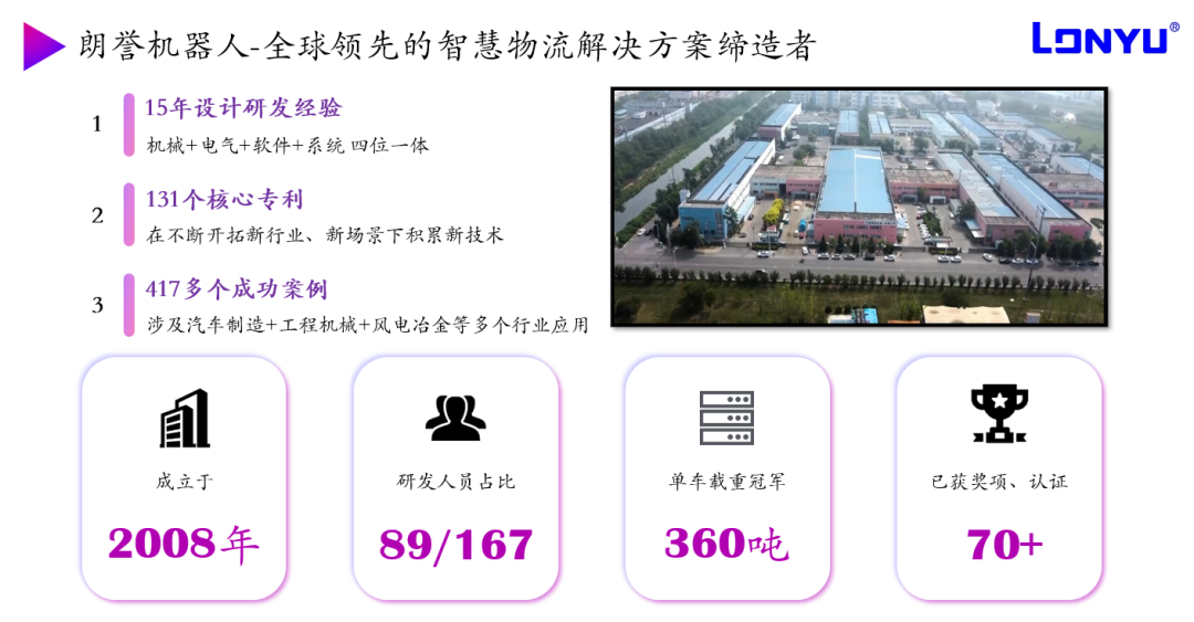 朗誉机器人作为一家全球领先的重载AGV公司,集研发、设计以及生产制造为一体,致力于重载AGV及智慧工厂、智能物流领域的专业研发与生产,专业为客户提供以智能物流技术、工业物联网和大数据中心等技术做支撑的重载智能物流管理系统,解决超重、超长、超大物料的智能化运输问题。