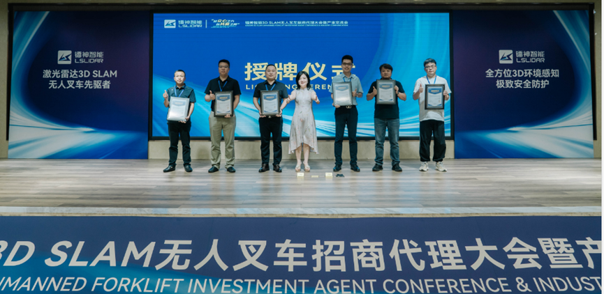 董事合伙人童海燕女士亲自为合作伙伴颁发授牌,这次授牌仪式标志着镭神智能与众多合作伙伴之间建立起长期、紧密、实效的合作关系,旨在共同推动多线激光雷达定位导航技术的应用高峰。合作伙伴们将共享资源,优势互补,以实现互利共赢为目标,齐心协力推动智能制造行业的进一步发展。