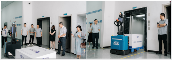 镭神智能通过在徐州自动化工厂部署了无人叉车梯控演示,现场演示无人叉车联通电梯控制,自主进出电梯完成货物的上下楼运输,助力工业上楼。