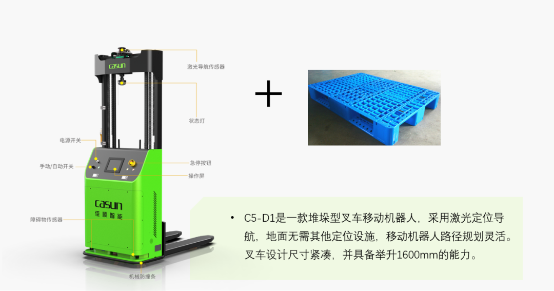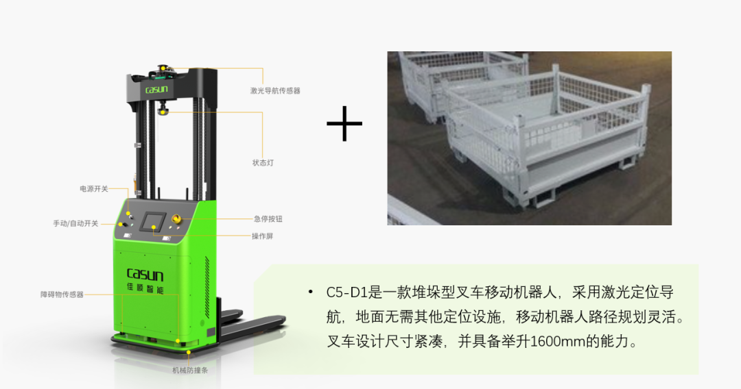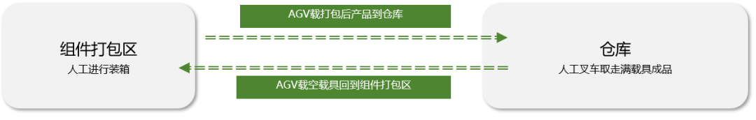 佳顺智能机器人主要解决了光伏组件成品入库搬运作业,组件成品人工装箱后,通过移动机器人搬运成品到仓库内。