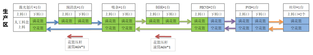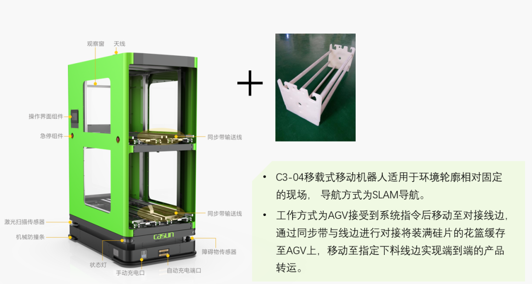 佳顺智能机器人主要解决了硅片的高频次搬运作业,从发料机通过移动机器人,自动搬运料满BIN盒至制绒工序自动线边。