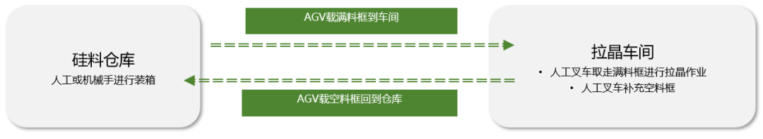硅料仓库通过机械手或人工装箱后,通过移动机器人搬运料框到拉晶车间内。