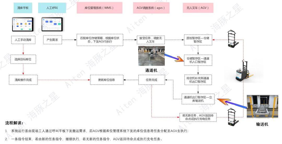 2、物流动线:①.质检暂存区→仓储暂存区(质检区人工补充物料)②.仓储暂存区→通道机入口暂存区(入口物料流转后的空托由AGV搬运至通道机出口托盘位)③.通道机出口暂存区→立库输送机
