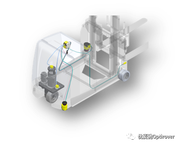 安全系统包含安全控制和安全避障两部分,通过编码器、扫描仪、接近开关、钥匙开关及安全控制器的感应与控制,使得驱动电机速度安全可控、车体行驶可安全避障、货叉离地高度安全可控、电源安全可控。