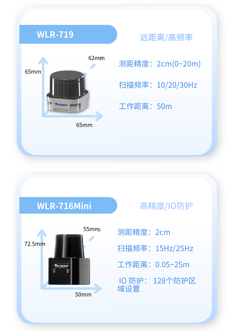 基于万集激光多年的技术积累与行业理解,万集激光推出WLR-716Mini、WLR-719两款产品,以标准化、高性能、高性价比的激光雷达产品,匹配全新阶段AMR应用需求。