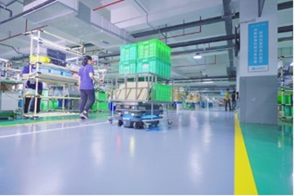 【建霖家居的卫浴产品组装车间内 MiR250 AMR 搭配顶升装置与 Shelf Carrier】