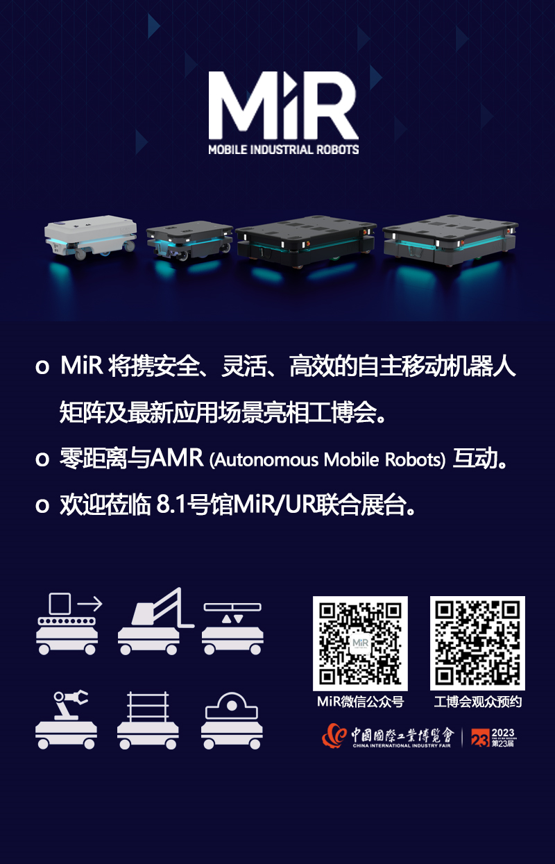 目前 MiR 已经在中国市场迅猛发展,AMR 产品已广泛应用于电子、汽车、半导体、快消品、食品饮料、医疗健康等诸多领域。一直以来,MiR 不遗余力地深入市场了解客户切实需求,致力于为更多企业提供智能物流解决方案。未来,MiR 将在今年 9 月 19 日 2023 第 23 届中国国际工业博览会上呈现更多全新技术成果,继续展示出其大规模部署能力,帮助更多行业优化内部物流效率,为行业全面自动化升级贡献力量。