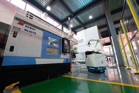 武汉船舶在其用于科研与教学的船用零部件自动化示范产线上部署了一台 MiR 移动复合机器人,该解决方案由 MiR250 AMR 搭载 FANUC CRX-10iA 协作机器人组合,负责产线上全链路关键生产环节的物流对接,能够执行包括立体货柜取料、自动上下料工序、成品取放、货柜入库等多重任务,在设备集成度高、精度复杂的环境下稳定运行。