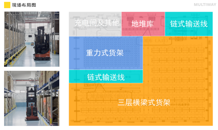 现场库位量近2000个,共两种货架形式,分别是三层横梁式货架和三层重力式货架。横梁式货架通过横梁的设置,提供了更多的存储空间;而重力式货架利用物体的重力,实现货物的自动滑动。