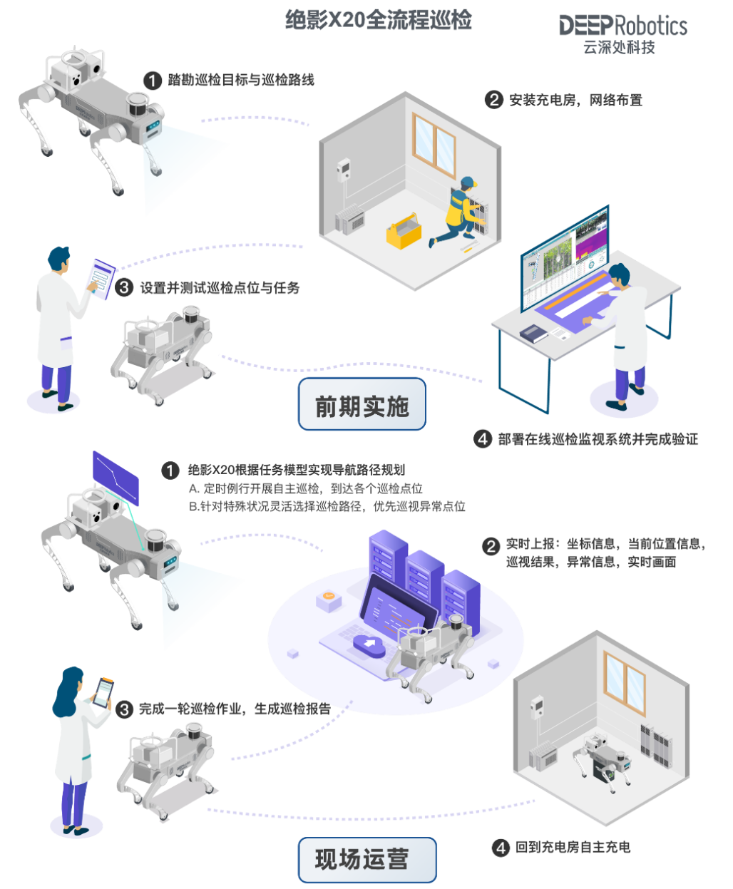 以电力巡检为例,传统机器人巡检方案的应用场景仍然有一定限制,例如不能实现全域检查,复杂环境仍需人工干预等。而云深处的产品可在室内室外自由贯通,完成上下楼梯、穿越复杂地形、自主充电、以及智能分析等作业动作,有效解决了用户痛点。