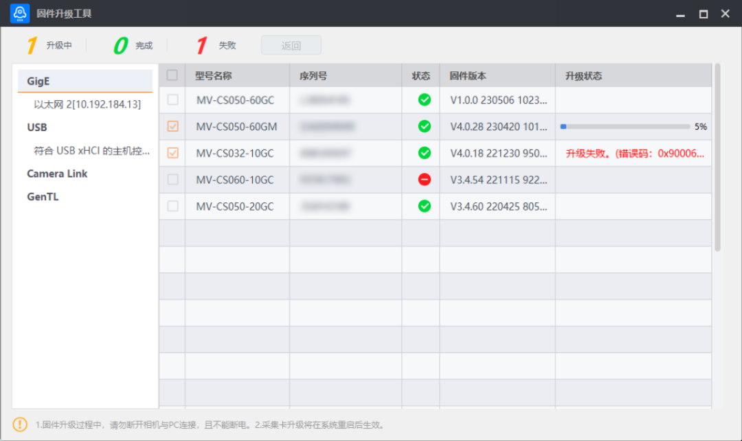 工具可批量升级多个相机或采集卡固件,最多可同时勾选20个相机或采集卡。