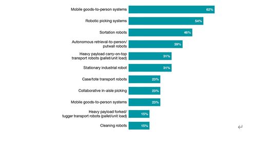 早期采用者已经使用的机器人类型反映了用例的优先级,机器人拣选系统占正在使用的机器人的50%。他们紧随其后的是