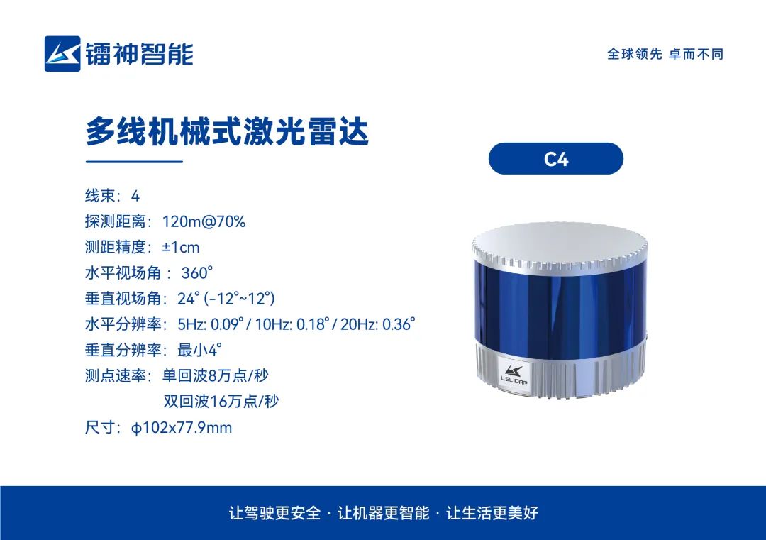 通过对激光雷达进一步的综合成本控制,镭神智能多线机械式激光雷达C4、C8和CH16R进行全新升级优化,使其探测精度更高、探测点云更稳定、抗光干扰能力更强,在保证可靠性、稳定性和功能性的同时,不断优化产品方案。