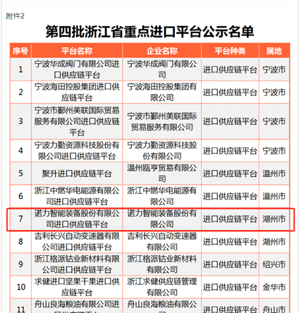 近日,浙江省商务厅公布第四批浙江省进口贸易促进创新示范区和重点进口平台名单,诺力智能装备股份有限公司进口供应链平台获授浙江省重点进口平台。