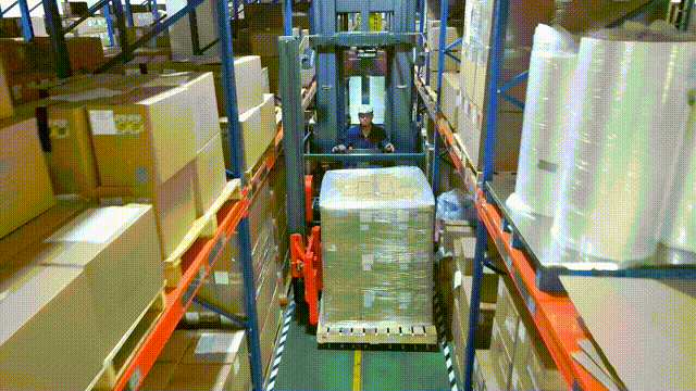 3、人上型三向叉车货叉180°旋转+左右侧移,在1.6米极窄通道内无需转动车身即可完成左右两侧货物堆垛,操作简单,大幅提升作业效率;