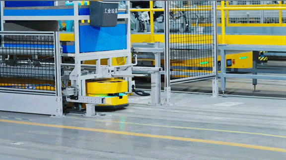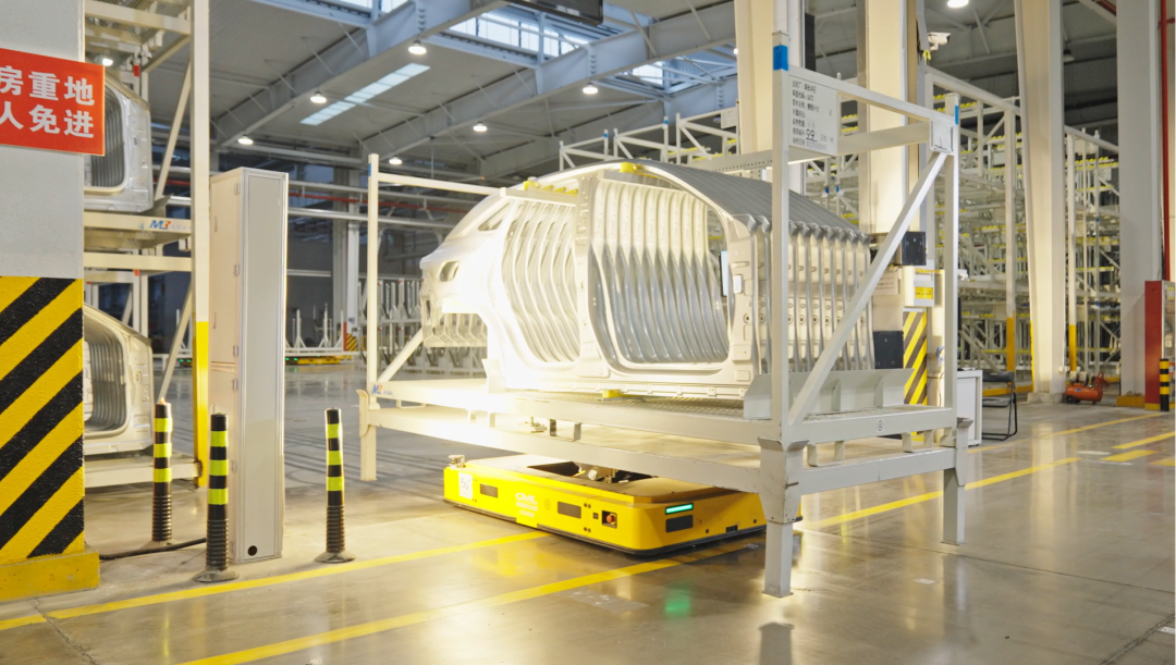 内饰线、完成线采用全新定制的重载AMR替代传统的滑板线,重载AMR可将车体举升和运送,同时设置物流同步搬运装置,实现打包物料同步;潜伏AMR、牵引AMR自动配送所需物料到产线,在满足滑板线基本功能的基础上,达到生产线柔性部署、节拍调整灵活的效果。