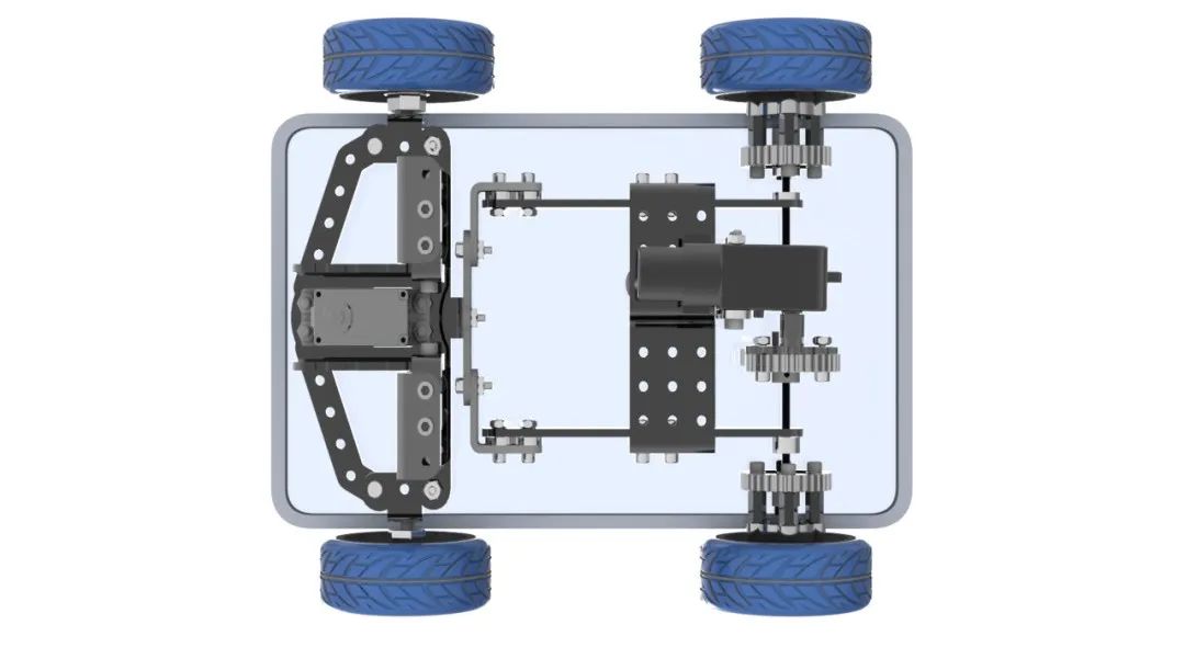 四驱差速底盘结构由四个差速轮作为驱动轮组成,驱动每个车轮的力矩分配系统,将动力传递到车辆的四个轮子上,可以实现原地转向运动。小车可以根据路面状况和车辆动力需求自动调整每个车轮的扭矩分配,以提供最佳的牵引力和操控性能。