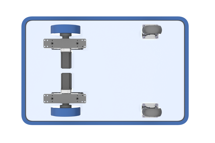 两驱差速底盘结构由两个差速轮作为驱动轮和随动轮组成。在自动运行状态下该底盘小车能做前进、后退行驶并能垂直转弯。和舵轮驱动的四轮行走机构小车相比,该车型由于省去了舵轮,不仅可以还能节省空间,小车可以做的更小些,因此常用于潜伏式AMR。