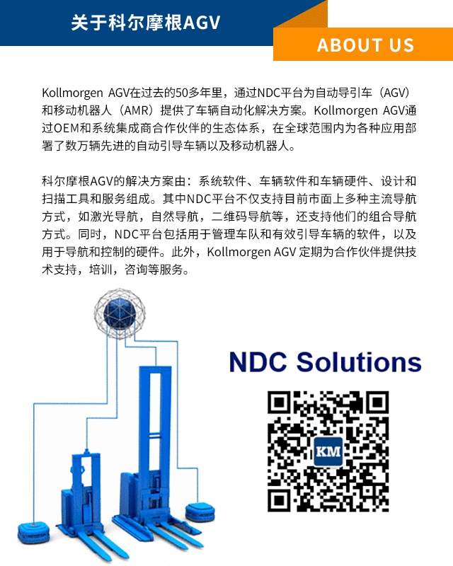 Kollmorgen AGV在过去的50多年里,通过NDC平台为自动导引车(AGV)和移动机器人提供了车辆自动化解决方案。通过OEM和系统集成商合作伙伴的生态体系,在全球范围内为各种应用部署了数万辆先进的自动引导车辆。